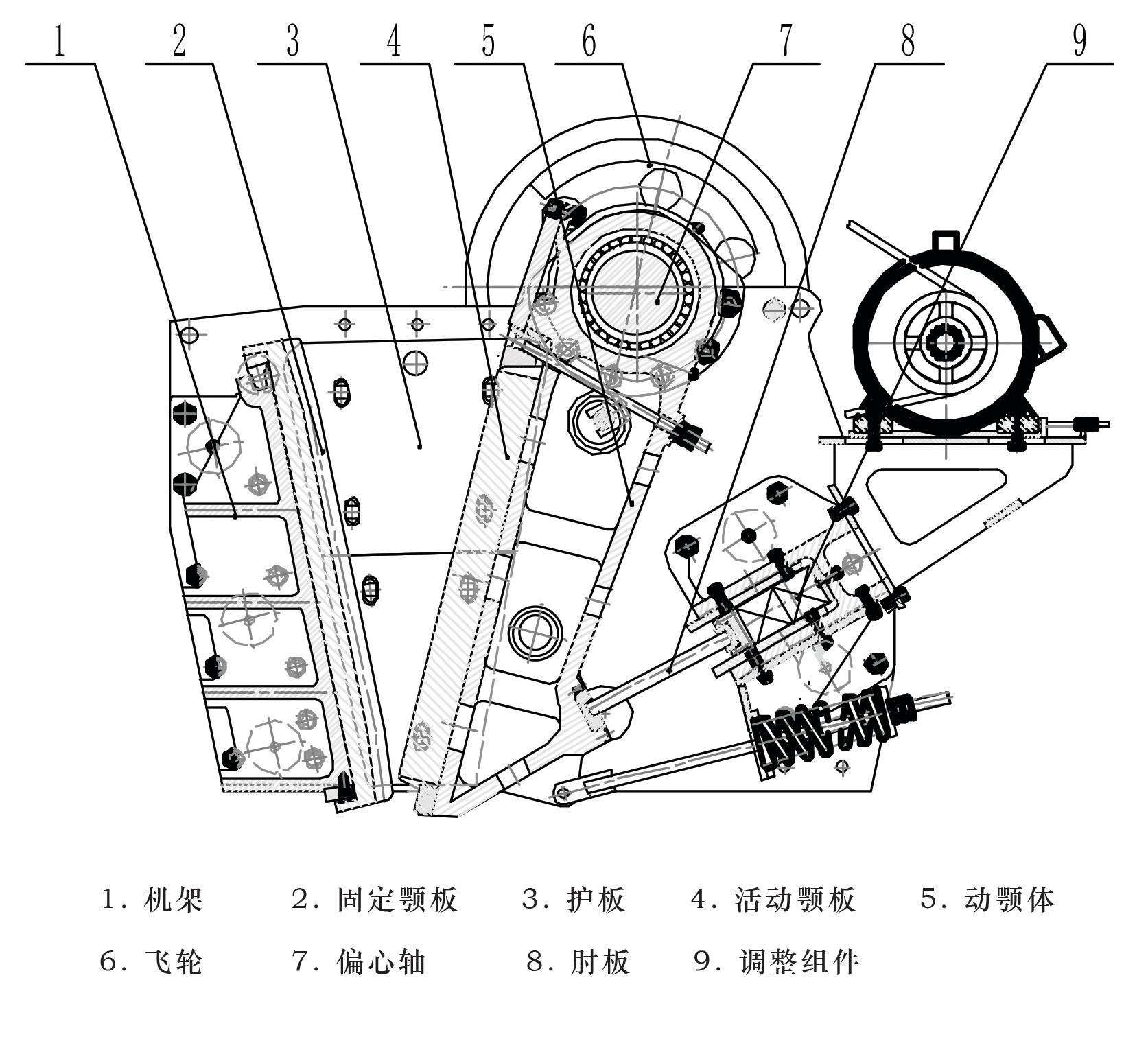 颚式破碎机工作原理是:电动机驱动皮带和皮带轮,通过偏心轴使动颚上下运动,当动颚上升时肘板与动颚间夹角变大,从而推动动颚板向固定颚板接近,与此同时物料被压碎或劈碎,达到破碎目的;当动颚下行时,肘板与动颚夹角变小,动颚板在拉杆,弹簧的作用下,离开固定颚板,此时已破碎物料从破碎腔下口排出。随着电动机连续转动而破碎机动颚作周期运动压碎和排泄物料,实现批量生产。