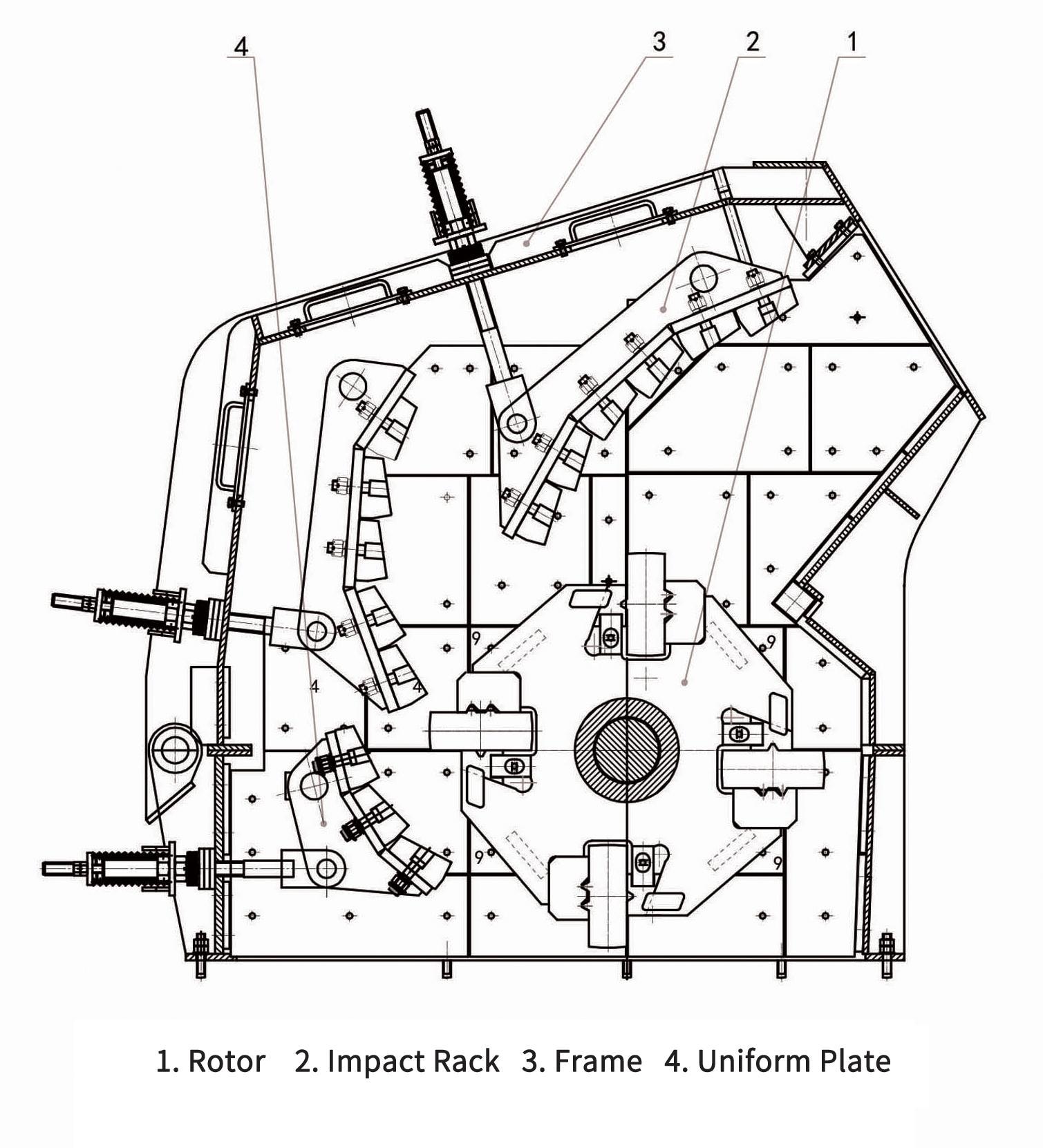 Impact crusher crushers material by striking energy. When it works, the motor drives the rotor rotate at a high speed, on which the low bar is installed. As soon as the material get into the affecting area of the blow bar, they will be stroke by the blow bar and be thrown to the impact devices around the rotor. The high speed forces the material to rebound from the impact liner to the area where the blow bar effects until they have been crushed to the required size. The clearance between the impact racks and the rotor can be adjusted to change the size and shape of the end products.
