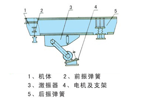振动给料机是利用振动器中的偏心块旋转产生离心力,使筛厢、振动器等可动部分作强制的连续的圆或近似圆的运动。振动给料机是由给料槽体、激振器、弹簧支座、传动装置等组成。槽体振动给料的振动源是激振器,激振器是由两根偏心轴(主、被动)和齿轮副组成,由电动机通过三角带驱动主动轴,再由主动轴上齿轮啮合被动轴转动,主、被动轴同时反向旋转,使槽体振动,使物料连续不断流动,达到输送物料的目的。