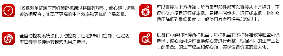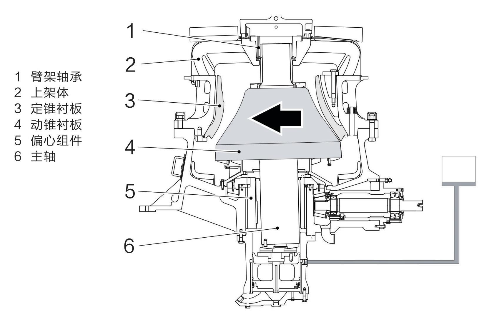 单缸圆锥破碎机工作时:电机带动破碎机的小齿轮,小齿轮带动大齿轮,大齿轮组件(大齿轮、大齿轮架、偏心钢套)带动偏心套组件(偏心缸套、偏心铜套)和主轴组件(主轴、内锥、内锥衬板)以理论垂直线为中心,在铜衬套内公转,主轴组件在偏心铜套内以主轴的中心线可以实现自转。空机运行的时候,偏心套组件“抱着”主轴组件和随大齿轮一同公转,当物料加入到破碎腔后,主轴总成(主轴、内锥)在物料的阻力下在偏心铜套内缓慢的自转。内锥的运行轨迹看起来是在破碎腔内来回摆动,同时缓慢的旋转。物料被摆动的内锥挤压破碎。支撑套与架体连接处靠液压缸压紧,当破碎机内落入金属块等不可破碎物体时,单缸的动锥由底部液压活塞托起,起到排放口调整和过铁保护、反复起落排除堵矿的作用。